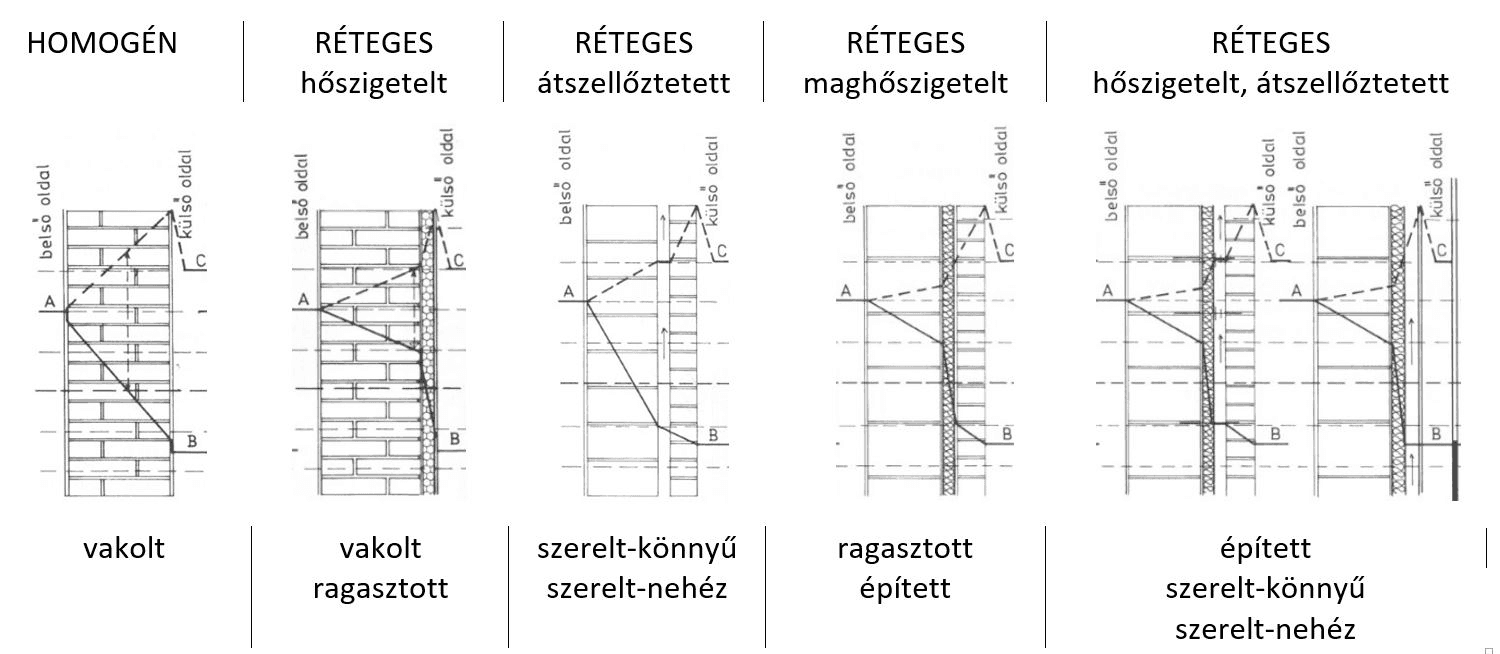 Az alábbiakban látható a falszerkezetek rétegfelépítés szerinti csoportosítása, illetve az egyes esetekben alkalmazható burkolatok.