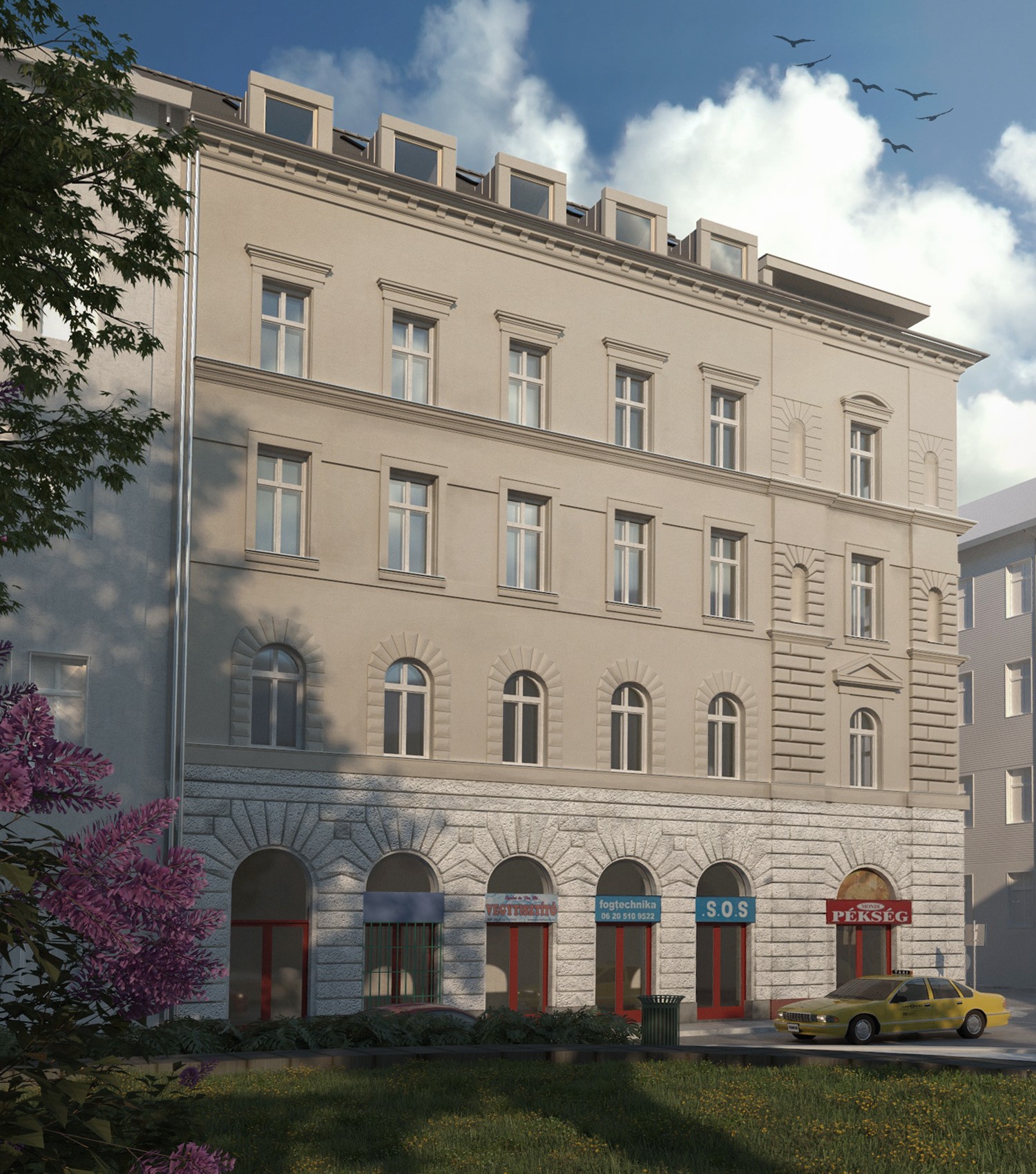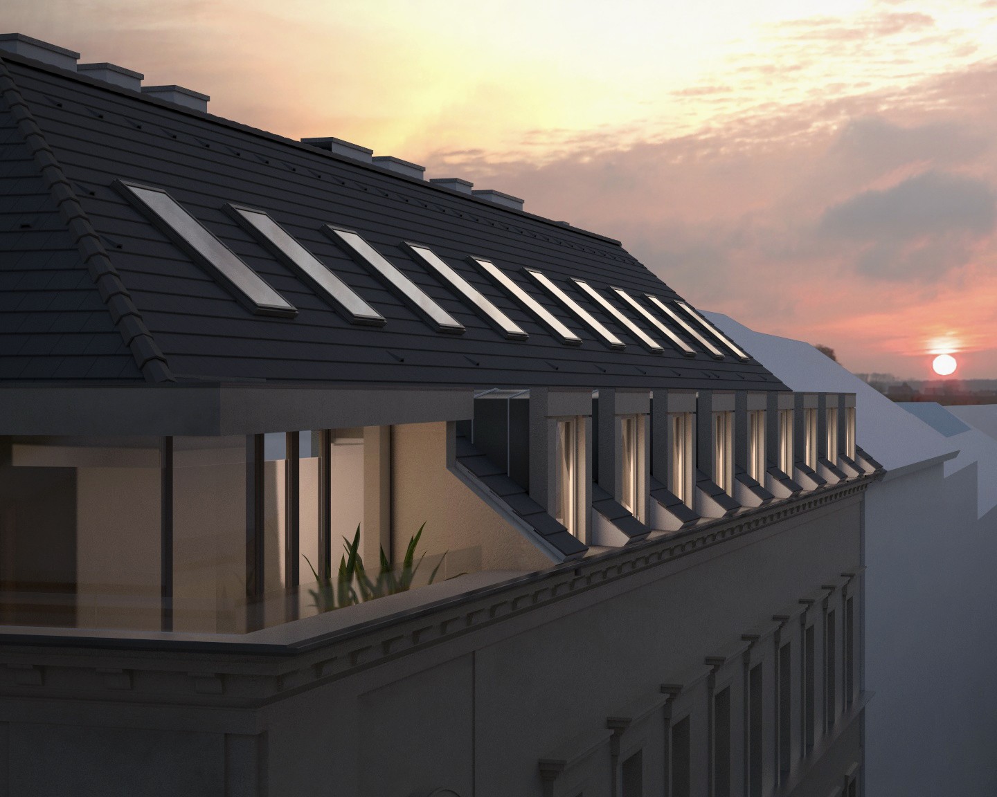 We have received a commission to build a loft in a ground floor + 3 storey apartment building situated in the VII. district of Budapest. The project was developed in collaboration with Otthon Építész Stúdió Kft. As part of the project, a new elevator will be installed in the apartment building, and the courtyard will be renovated. We have developed several versions of the street façade of the extension, with each version emphasizing the use of contemporary elements to enhance the corner balustrade. After careful consideration, we have decided to opt for roof-plane windows that blend into the grid, rather than structures with repetitive accentuated frames. In the courtyard, two roof levels are separated by a stepped setback under the lower pitched roof.