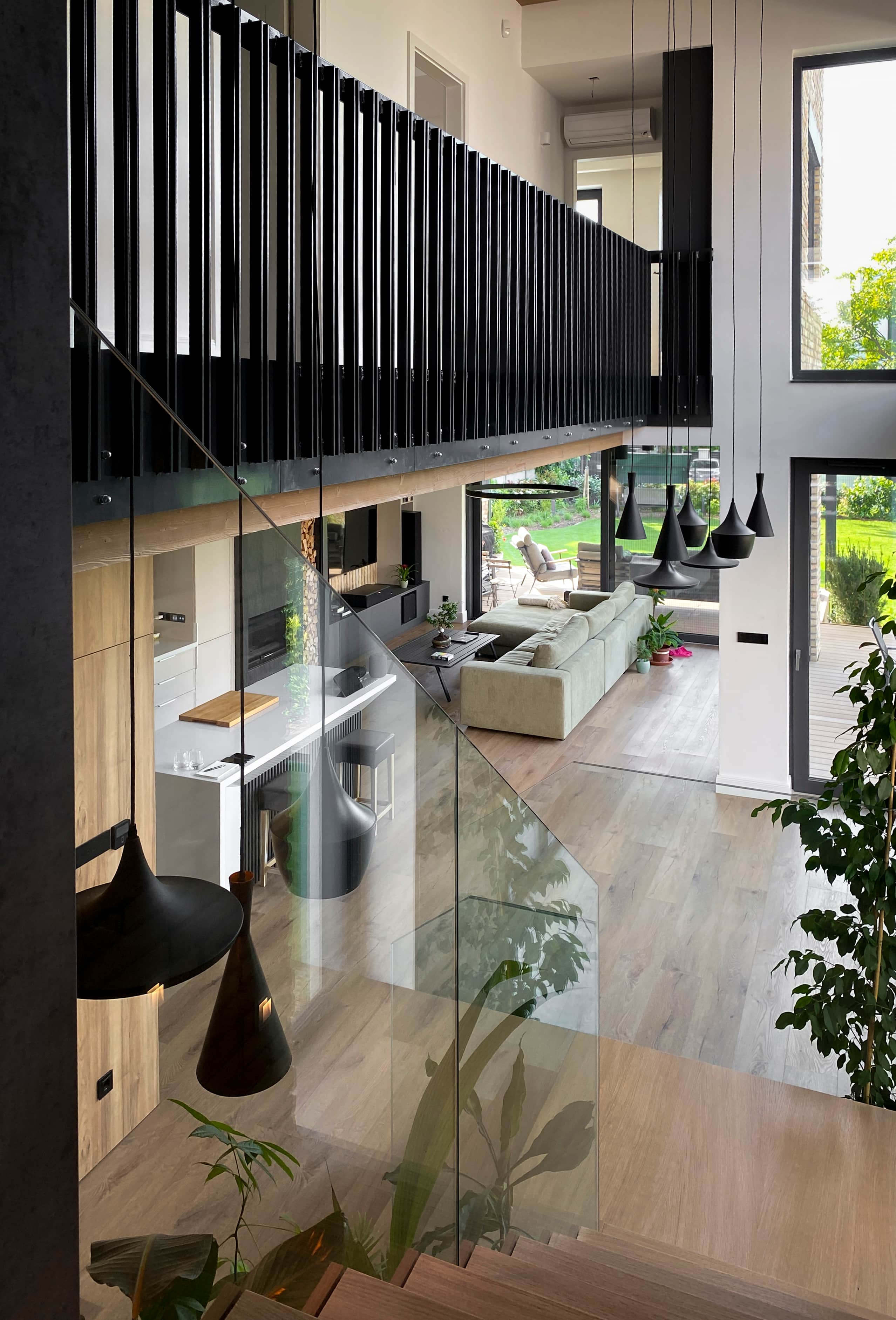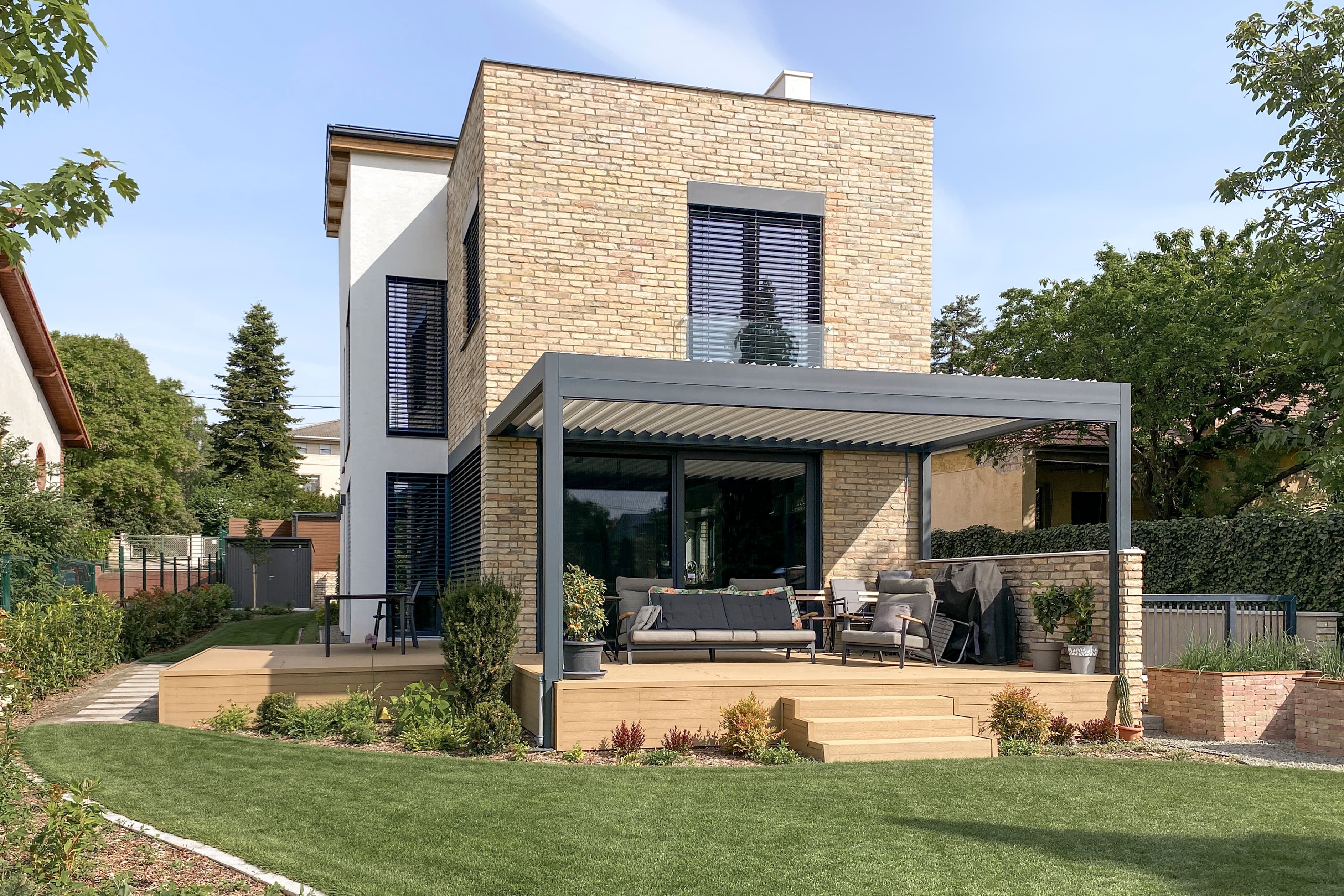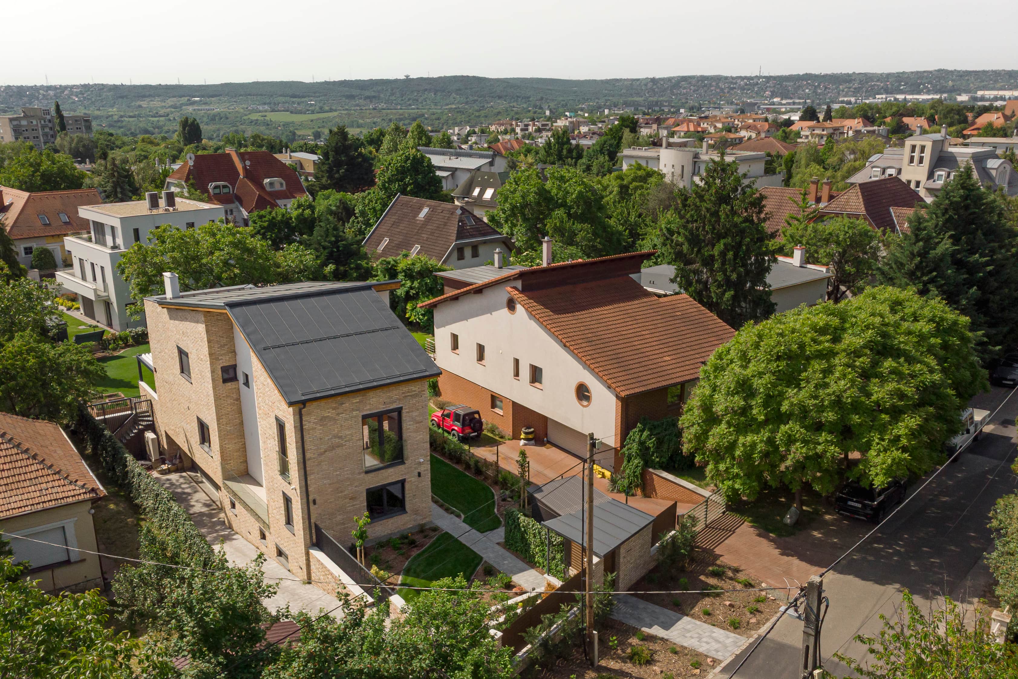 The property is situated in the XI district of Gazdagrét and has an elevated position. The front garden has a one-meter difference in height, but the building site is generally flat despite the terrain conditions. The building itself has a basement and two stories, which fits well with the narrow and long plot shape and the high surrounding roof. The house is built perpendicular to the longitudinal axis, which provides harmony with the surroundings. Additionally, there is an elegant and spacious two-story gallery, which can be used as a community space.